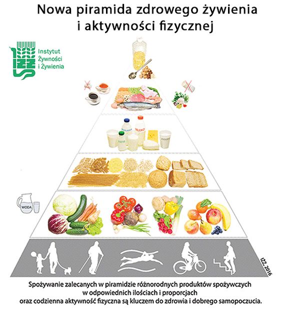 Piramida żywienia, to schematyczny, graficzny sposób przedstawienia zasad zdrowego odżywiania i proporcji składników, jakie powinny się znaleźć w zdrowej, zbilansowanej diecie. Piramidę żywienia opracowują zespoły ekspertów, na podstawie najnowszych doniesień naukowych, badań, rekomendacji WHO, danych statystycznych. I tak, na początku 2016 roku Instytut Żywności i Żywienia zaproponował nową, zmodyfikowaną piramidę zdrowego żywienia. Na czym polegają zmiany w odniesieniu do schematu obowiązującego od 2009 roku? U podstaw piramidy eksperci na stałe ulokowali aktywność fizyczną, uświadamiając nam w ten sposób, że nie istnieje zdrowe życie, bez ruchu. Najważniejszą zmianą jest „awans” owoców i warzyw, które zajęły zaszczytne i zasłużone miejsce, jako fundament nowej piramidy, przesuwając na druga pozycję, produkty zbożowe, które w dotychczas obowiązującym schemacie stanowiły podstawę diety. Zaleca się, by warzywa i owoce (w proporcjach: ¼ – owoce, ¾ – warzywa), stanowiły połowę tego, co jemy.